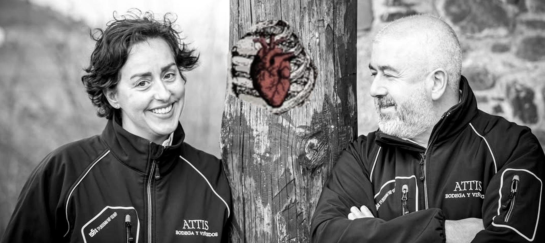 Winiarze z Attis Bodegas y Viñedos – twórcy projektów Sangarida – przy słupie ozdobionym symbolem serca. To oni stoją za winami z Bierzo, których etykiety opowiadają lokalne legendy i mitologiczne historie, łącząc pasję, naturę i sztukę opowiadania.
